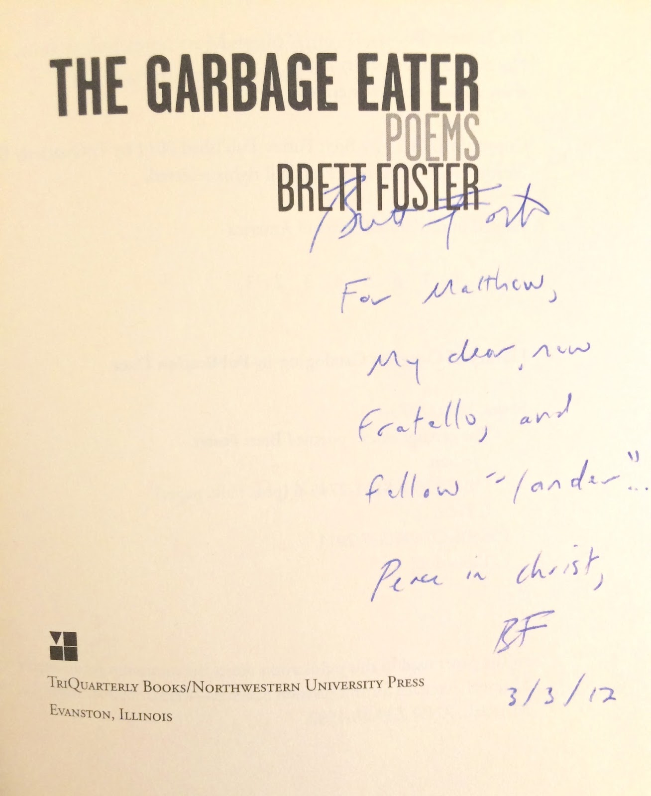I had thought the contrast of the two readings might be due to some kind of rivalry, but I quickly learned that Brett was friends with the poet who had read before. This is not surprising as Brett was friends with everyone, and was just then beginning to weave me into his ever-expanding circle. I bought his book that afternoon, and he inscribed it: