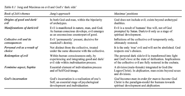 4. There are charts! And they really help. The Orthodox scholar G.C. Tympas (a wonderful synchronistic inversion of the C.G. in C.G. Jung) offers a challenging (and expensive) charitable reading of Jung. He nevertheless concludes that "there is a huge difference between Jung's active imagination, through which the ego encounters unconscious dynamics and aims the inner Self, and Maximus' compound psychic function that is able to directly experience the divine through prayer and spiritual contemplation" (166). Along the way, Tympas offers handily lays out the differences between Maximus the Confessor and Jung: